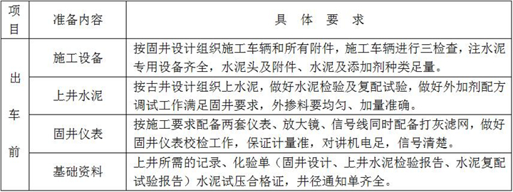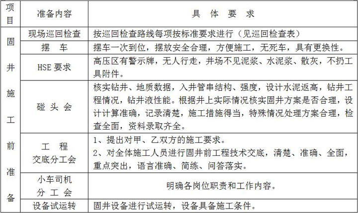 固井施工準(zhǔn)備是落實固井施工方案和固井設(shè)計重要的一個環(huán)節(jié),是固好一口井的前期準(zhǔn)備工作,具體內(nèi)容及要求如下: